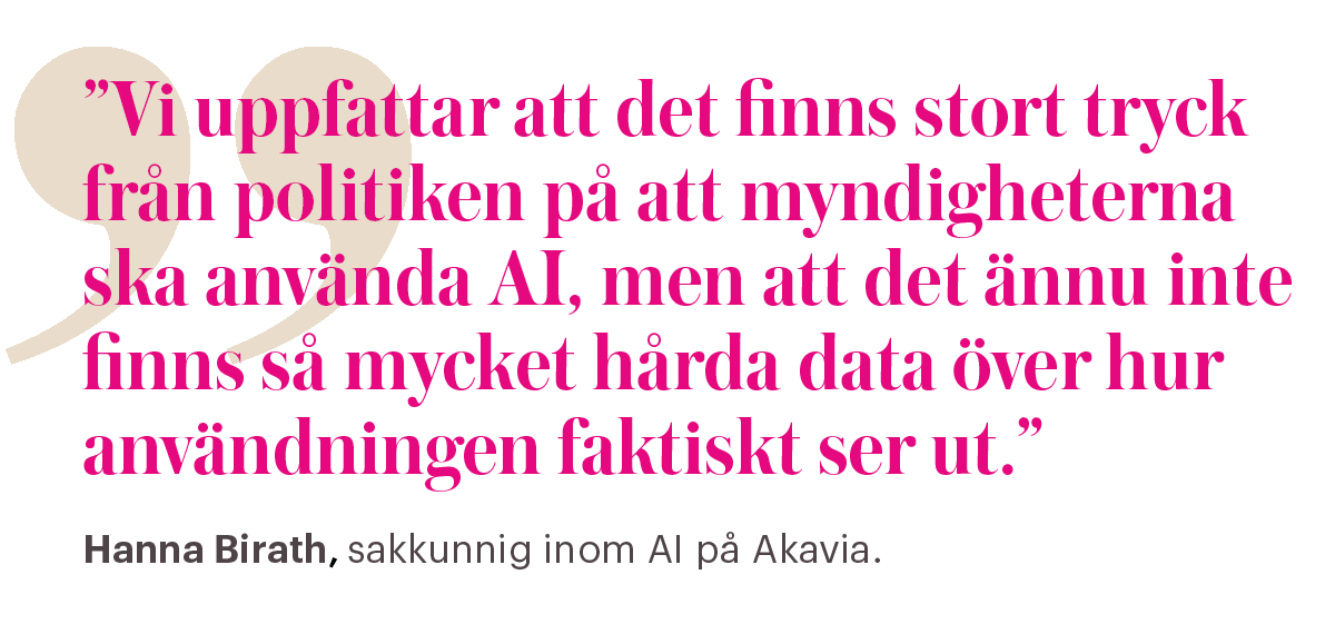 – Vi gjorde det här nedslaget eftersom vi uppfattar att det finns stort tryck från politiken på att myndigheterna ska använda AI, men att det ännu inte finns så mycket hårda data över hur användningen faktiskt ser ut, säger Hanna Birath, sakkunnig inom AI på Akavia.
