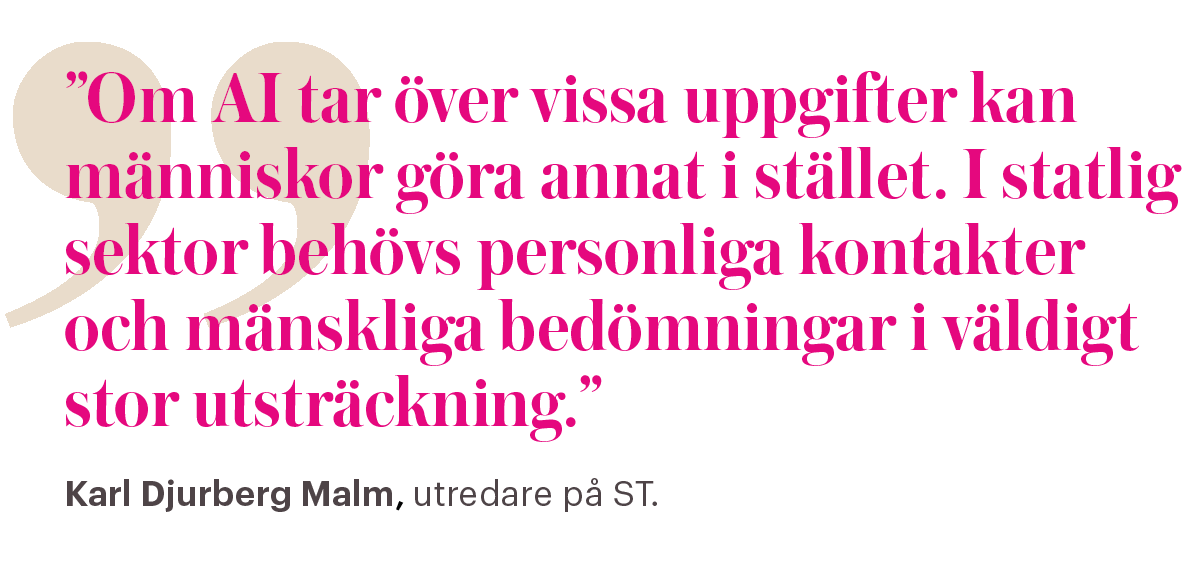 – Men frågan är felställd. Den antyder att en maskin ska ta över arbetsuppgifter och att människor inte kommer att behövas längre. Men om AI tar över vissa uppgifter kan människor göra annat i stället. I statlig sektor behövs personliga kontakter och mänskliga bedömningar i väldigt stor utsträckning. Alla beslut kommer inte att kunna fattas av AI, säger Karl Djurberg Malm.