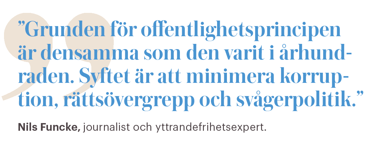 – Grunden för offentlighetsprincipen är densamma som den varit i århundraden. Syftet är att minimera korruption, rättsövergrepp och svågerpolitik. Det är en vacker princip, men den ska praktiseras också. Jag är rädd att den utveckling vi ser kommer att fortsätta, med allt fler begränsningar i öppenheten, säger yttrandefrihetsexperten Nils Funcke.