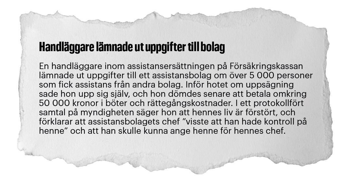 Den 4 mars 2020 dömdes en kvinna som varit anställd på Försäkringskassan i Västsverige till villkorlig dom och dagsböter. Brottet var grovt dataintrång. Kvinnan hade gjort slagningar på personer som fått assistansersättning och vilka bolag som stod för assistansen.