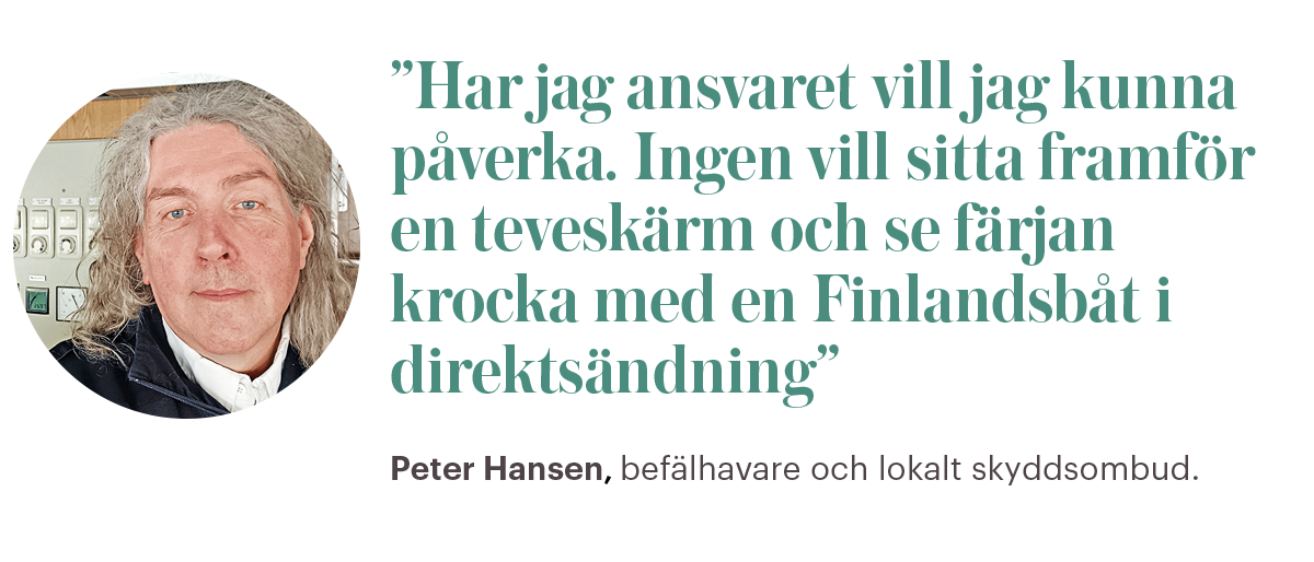 – Man har ansvar för 300 passagerare och en massa bilar, och det händer saker. Jag skulle aldrig sätta mig i den situationen, har jag ansvaret vill jag kunna påverka. Ingen vill sitta framför en teveskärm och se färjan krocka med en Finlandsbåt i direktsändning.
