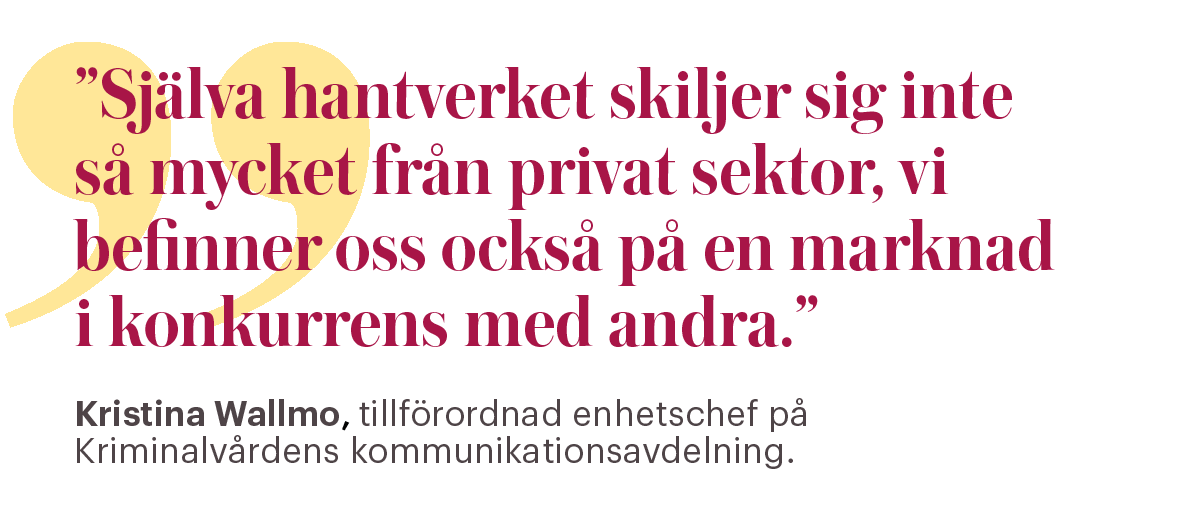 – Man har en oerhört stor makt. Därför finns det en risk när myndighetsvärlden blir som en reklambyrå. Marknadskrafterna är flyktiga och snabba, medan vår verksamhet behöver vara långsiktig och robust. Vi säljer inte kriminalvård, vi utför ett viktigt samhällsuppdrag.