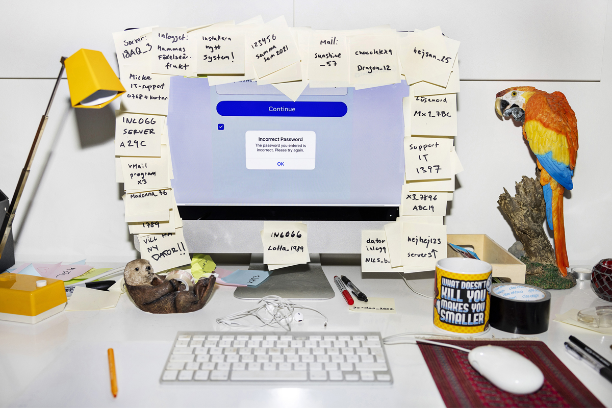 Fotot heter Lejonmanen och visar en datorskärm vars kanter är täckta med gula post-it-lappar. På dem finns allt från telefonnummer till it-support och påminnelser om att installera nya system till en mängd olika lösenord – de som är så lätta att glömma och samtidigt så viktiga om arbetsdagen ska flyta på smidigt och effektivt.
