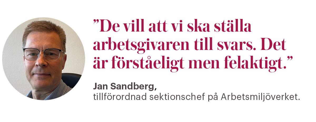 – De vill att vi ska ställa arbetsgivaren till svars. Det är förståeligt men felaktigt. Det här är ingenting vi utreder, det finns ingen som gör det. Lagen säger bara att man har rätt att väcka talan mot arbetsgivaren, säger Jan Sandberg, tillförordnad sektionschef på myndighetens inspektionsavdelning.