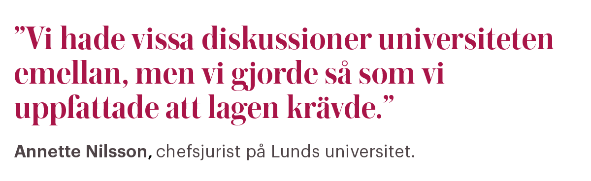 – Kanske. Vi hade vissa diskussioner universiteten emellan, men vi gjorde så som vi uppfattade att lagen krävde, säger Annette Nilsson.
